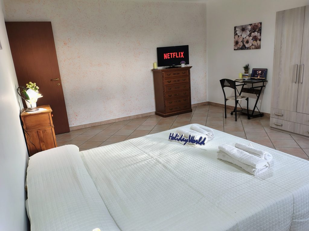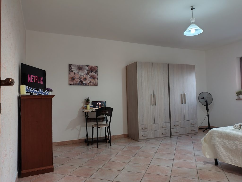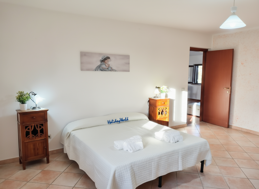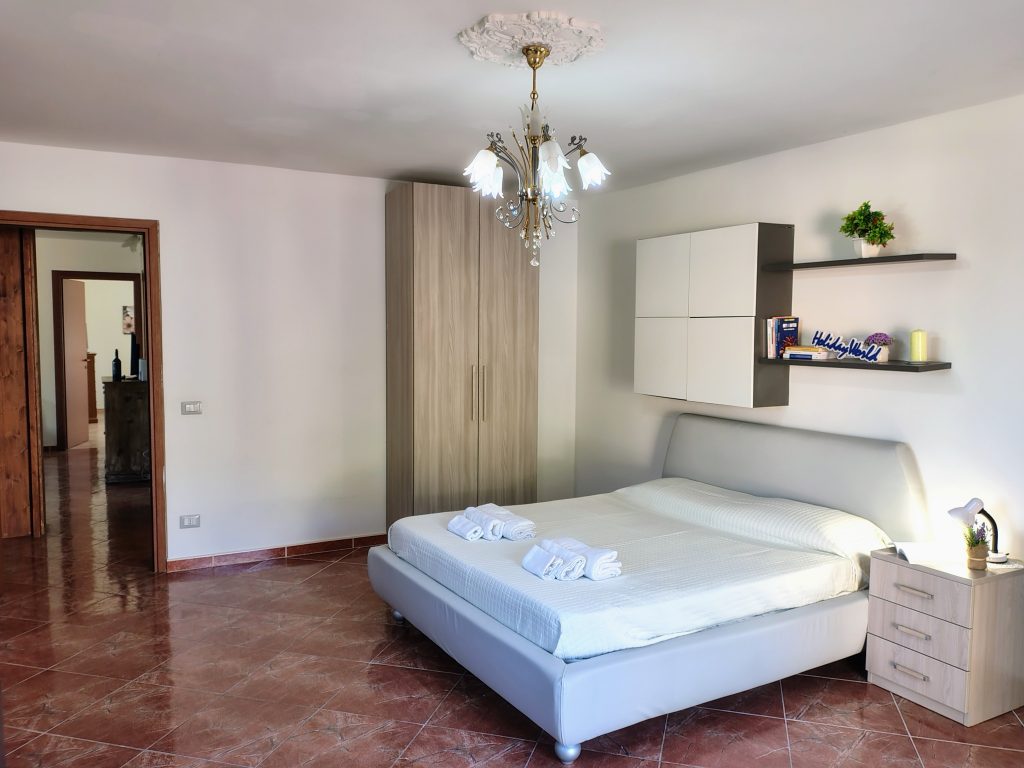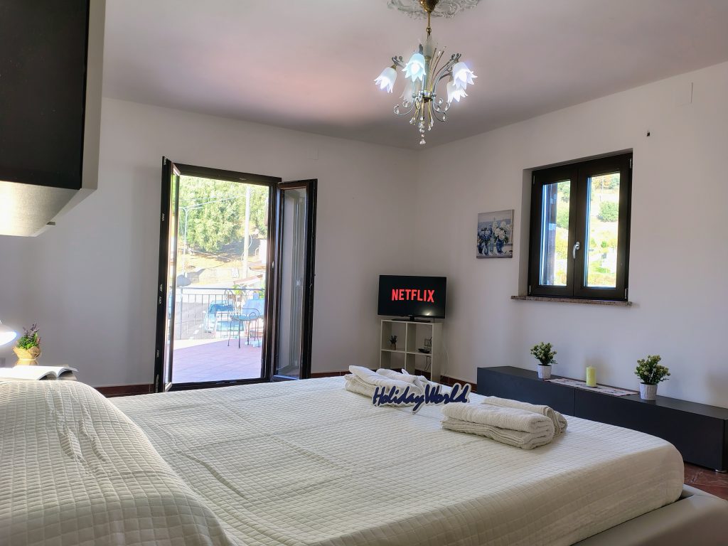 La prima camera matrimoniale è spaziosa e luminosa, arredata con letto matrimoniale, comodini, armadio a due ante, una piccola libreria e smart TV. Una finestra affacciata sulla campagna e una porta-finestra che conduce al terrazzino privato, arredato con tavolo e sedie. Da qui si gode una vista straordinaria sull’Etna e sulla campagna, con scorci di mare tra le colline. Il soggiorno è accogliente e luminoso, arredato con due divanetti, smart TV e un tavolo con quattro sedie. Accanto si trova la cucina abitabile, completamente attrezzata. La seconda camera matrimoniale è ampia e panoramica, arredata con letto matrimoniale, due armadi.