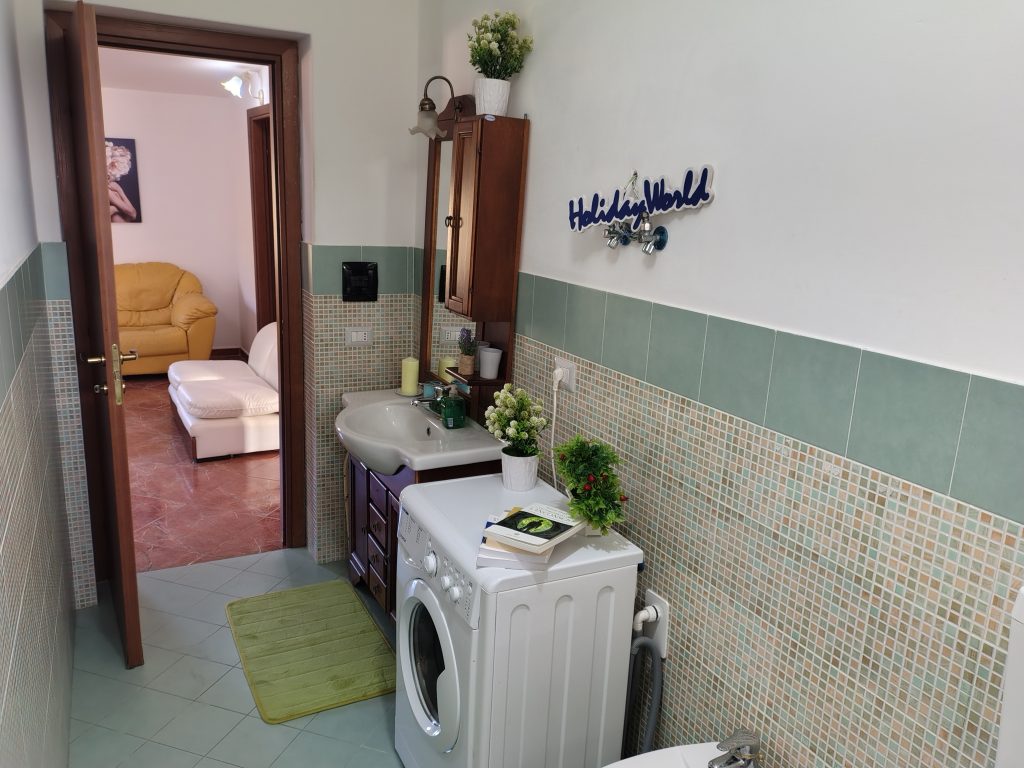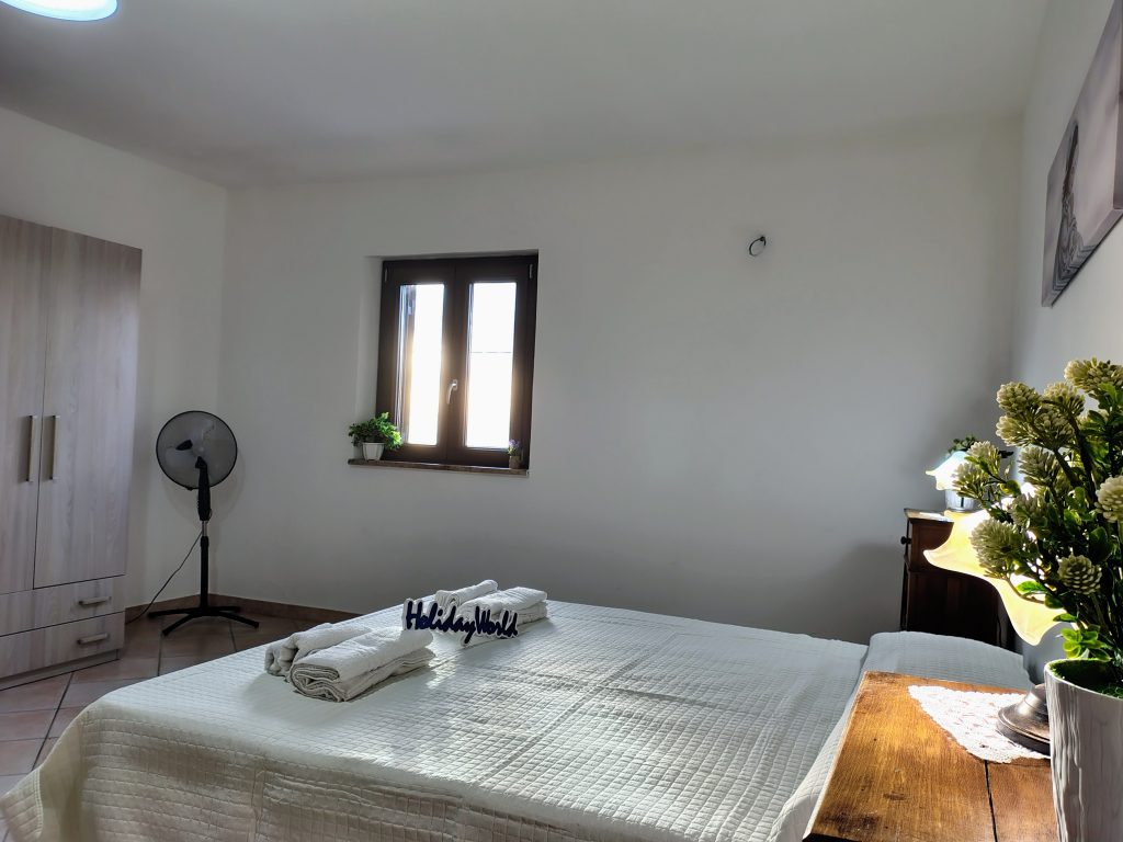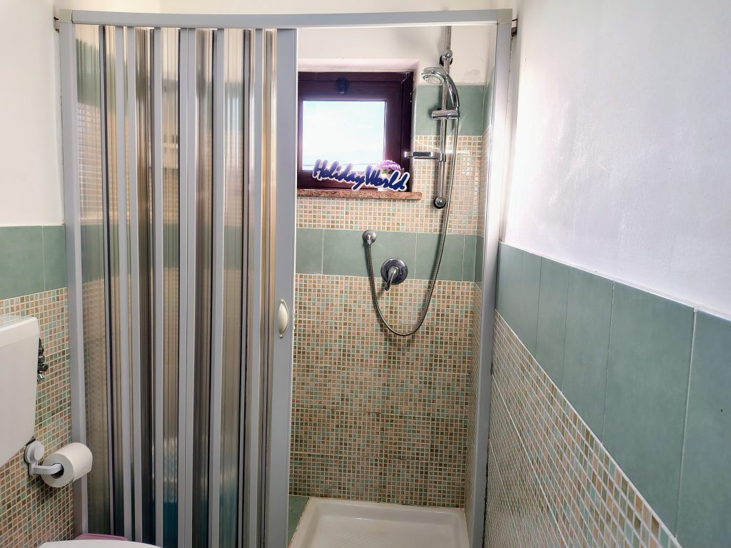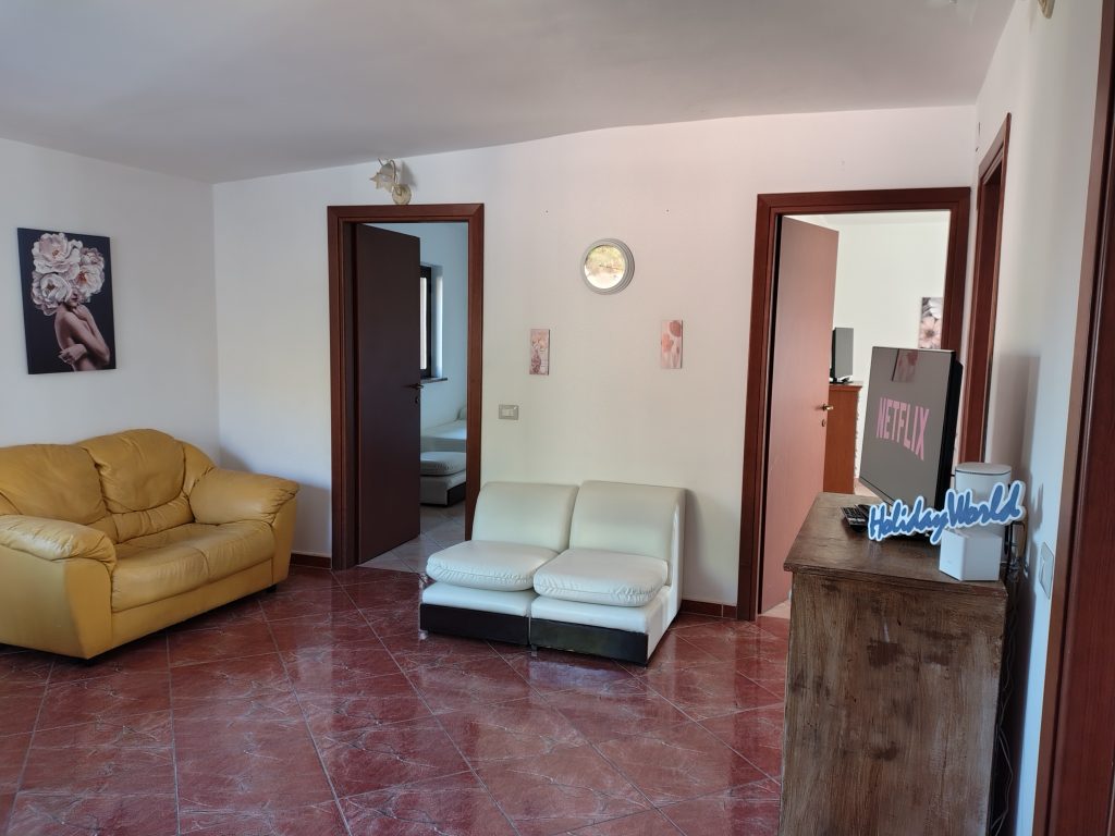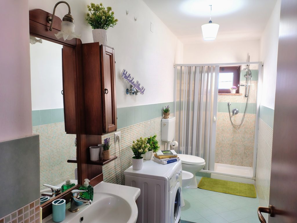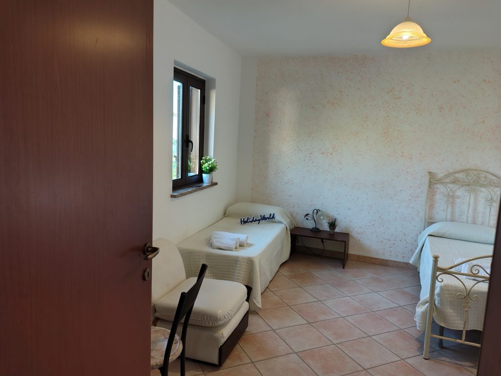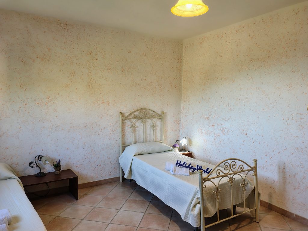 La terza camera, con due letti singoli, armadio, poltroncina e smart TV, affaccia sul lato campagna con scorci di mare: ideale per bambini o ospiti. Il bagno, finestrato, è completo di doccia, WC, bidet, lavandino e lavatrice, fornendo tutto il necessario per un soggiorno confortevole e autonomo.