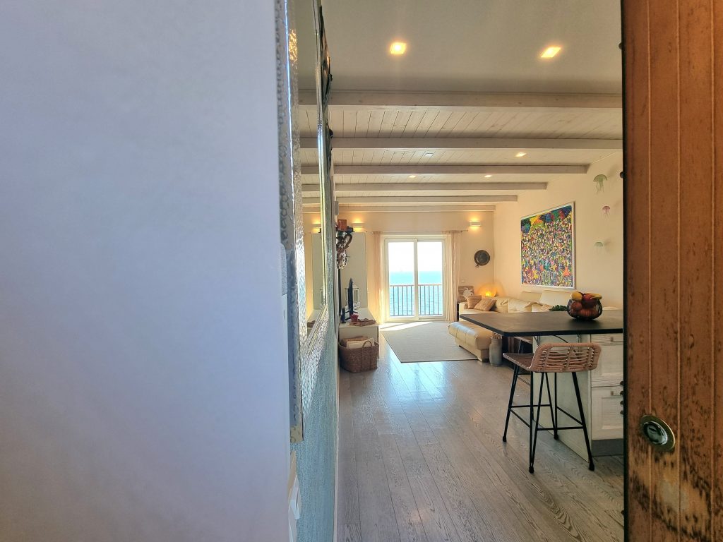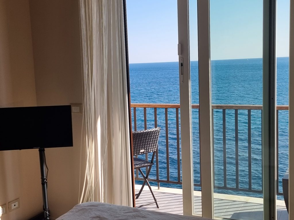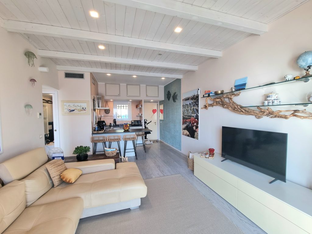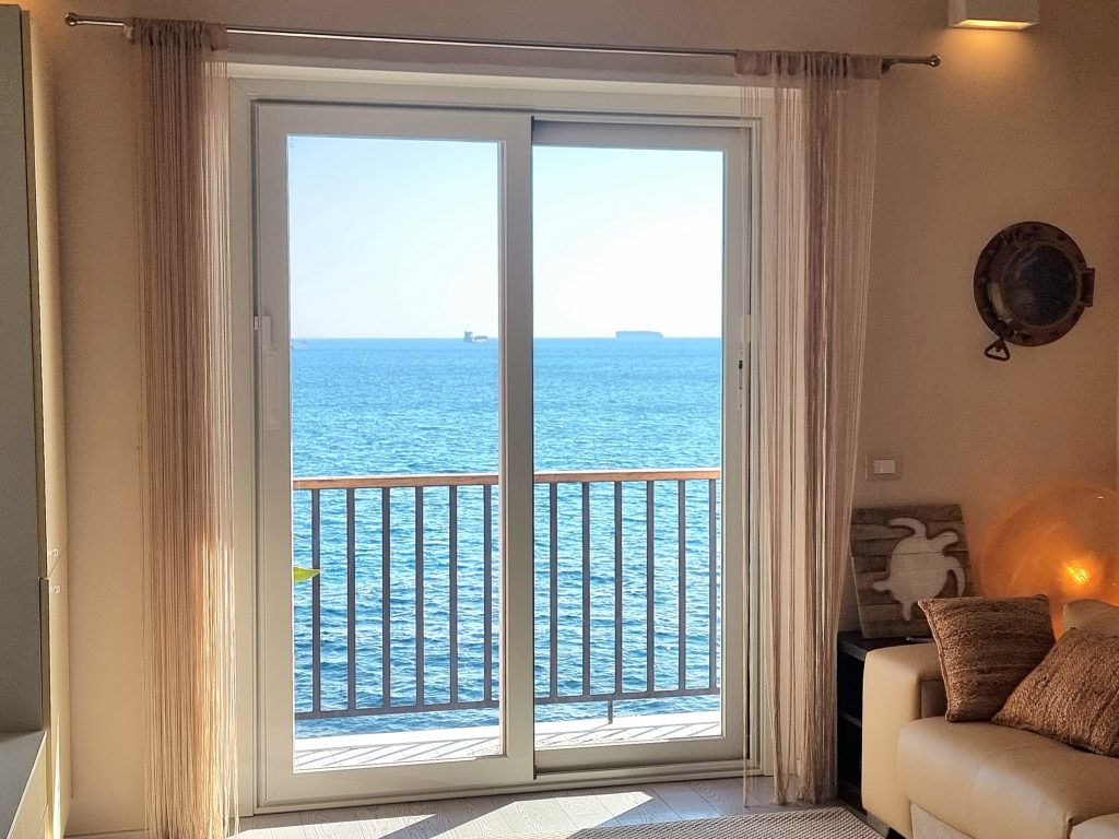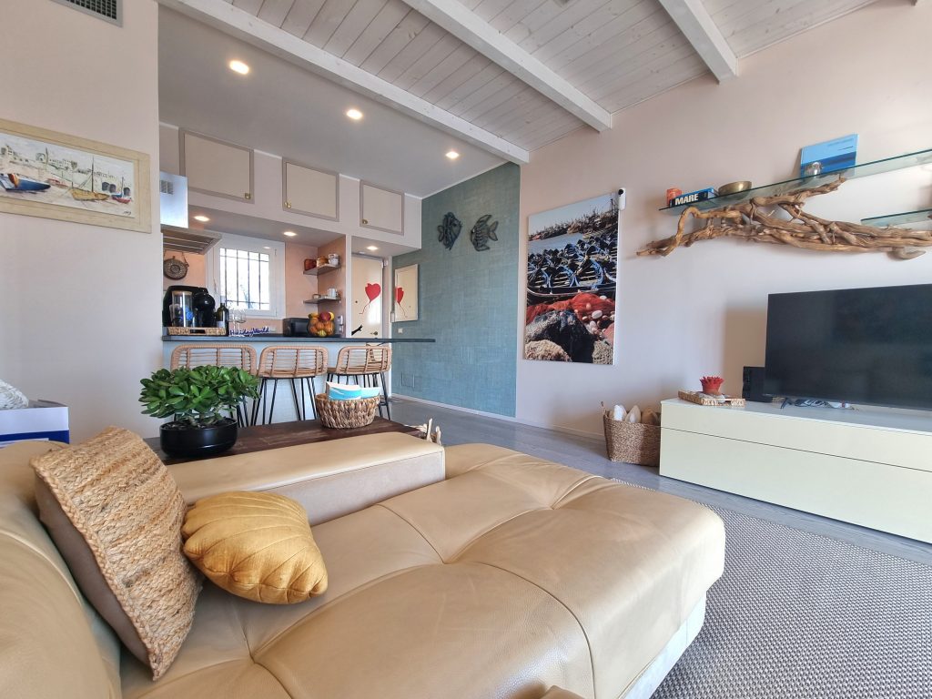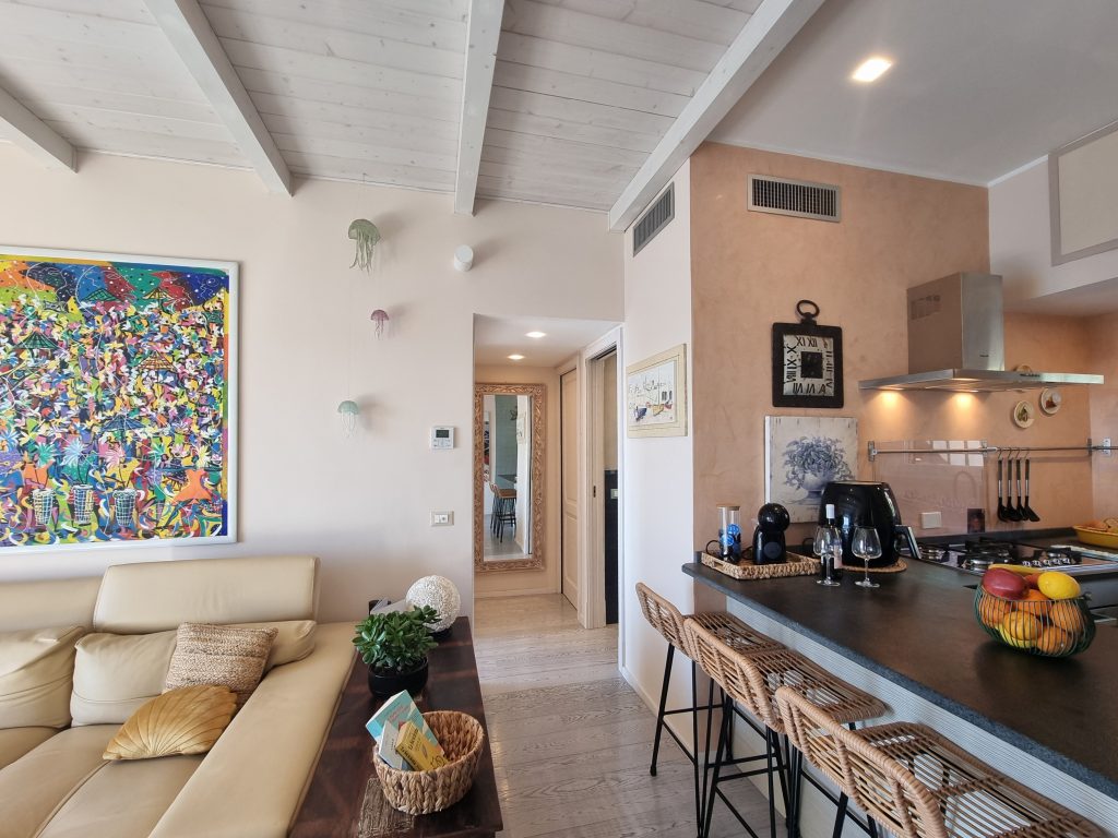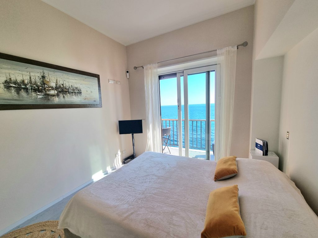 L’appartamento, con ingresso semi-indipendente, si apre su un soggiorno panoramico con cucina a vista e penisola. La grande vetrata fronte mare conduce a un balcone vivibile, che funge da cuore pulsante della casa: a questo si accede anche dalla camera matrimoniale, dotata di cabina armadio, permettendo di godersi la brezza e la vista delle onde direttamente dal letto. Al piano superiore, un terrazzo solarium di proprietà offre uno spazio esclusivo per cene sotto le stelle. La casa è dotata di climatizzazione, Wi-Fi, persiane elettriche e ogni elettrodomestico.