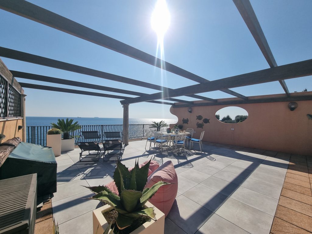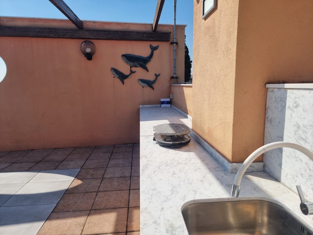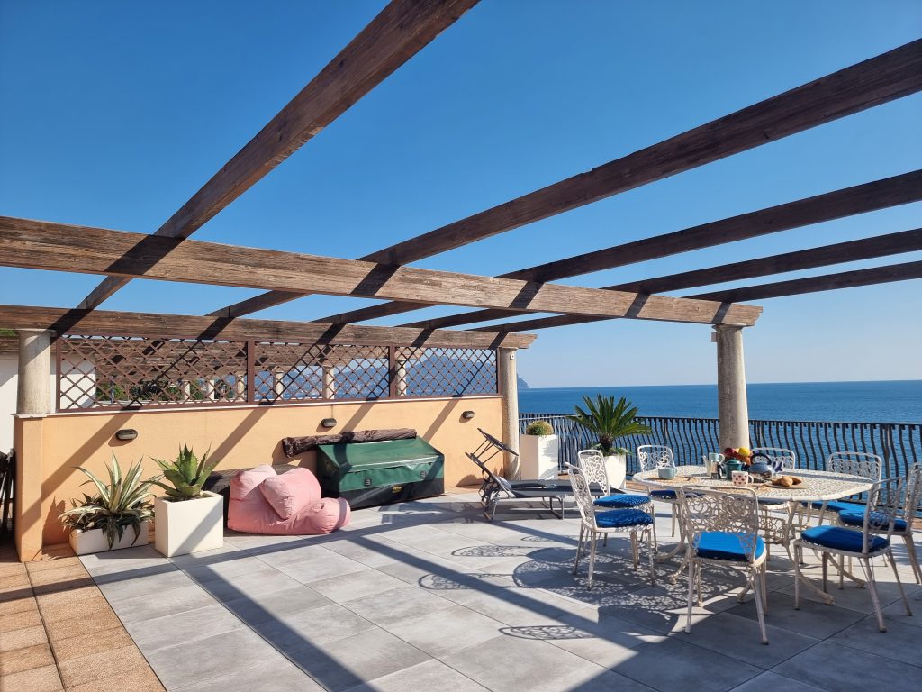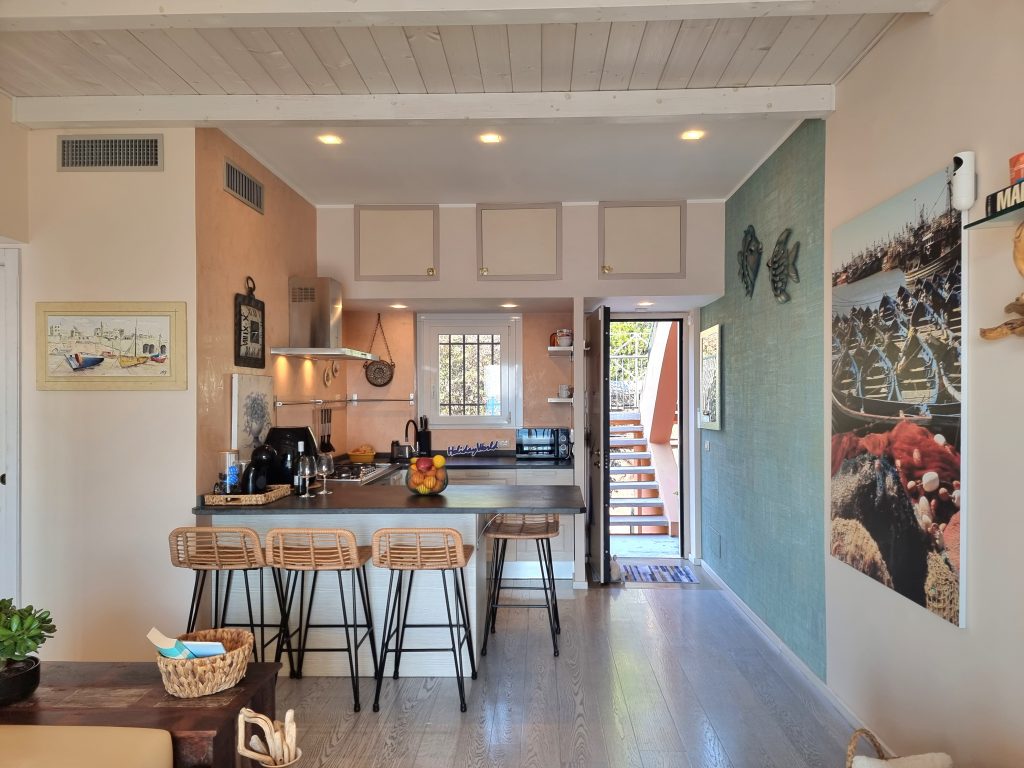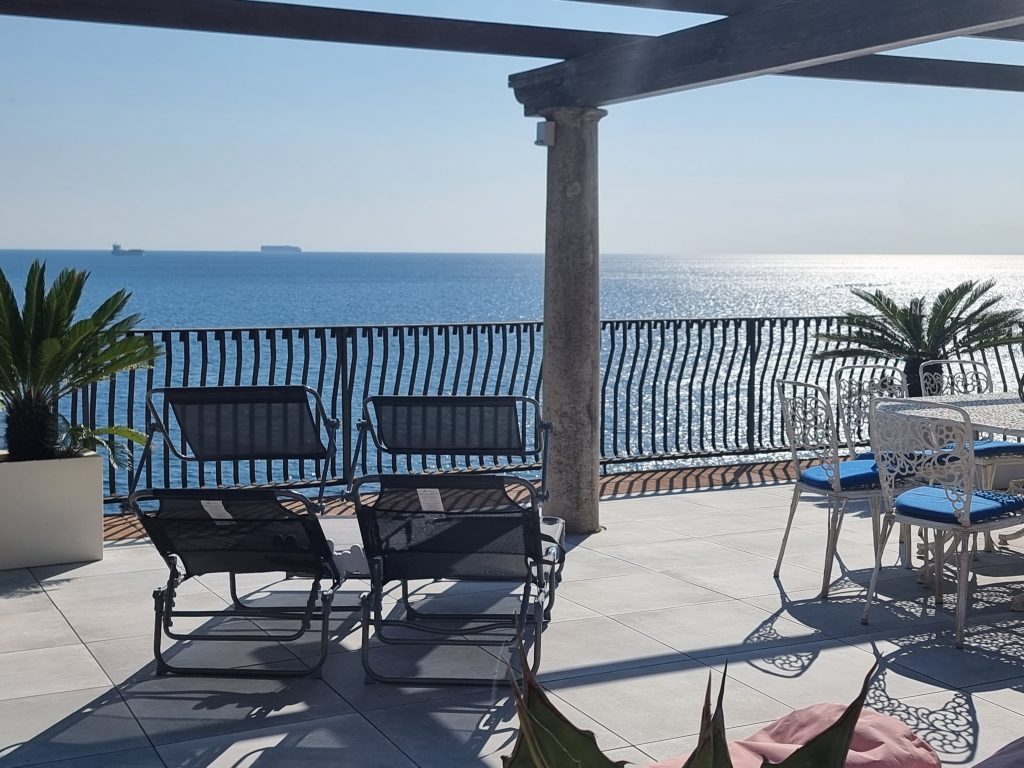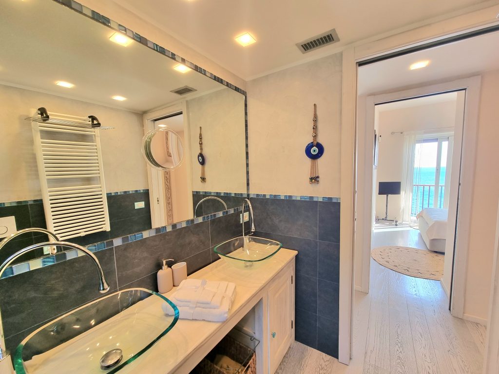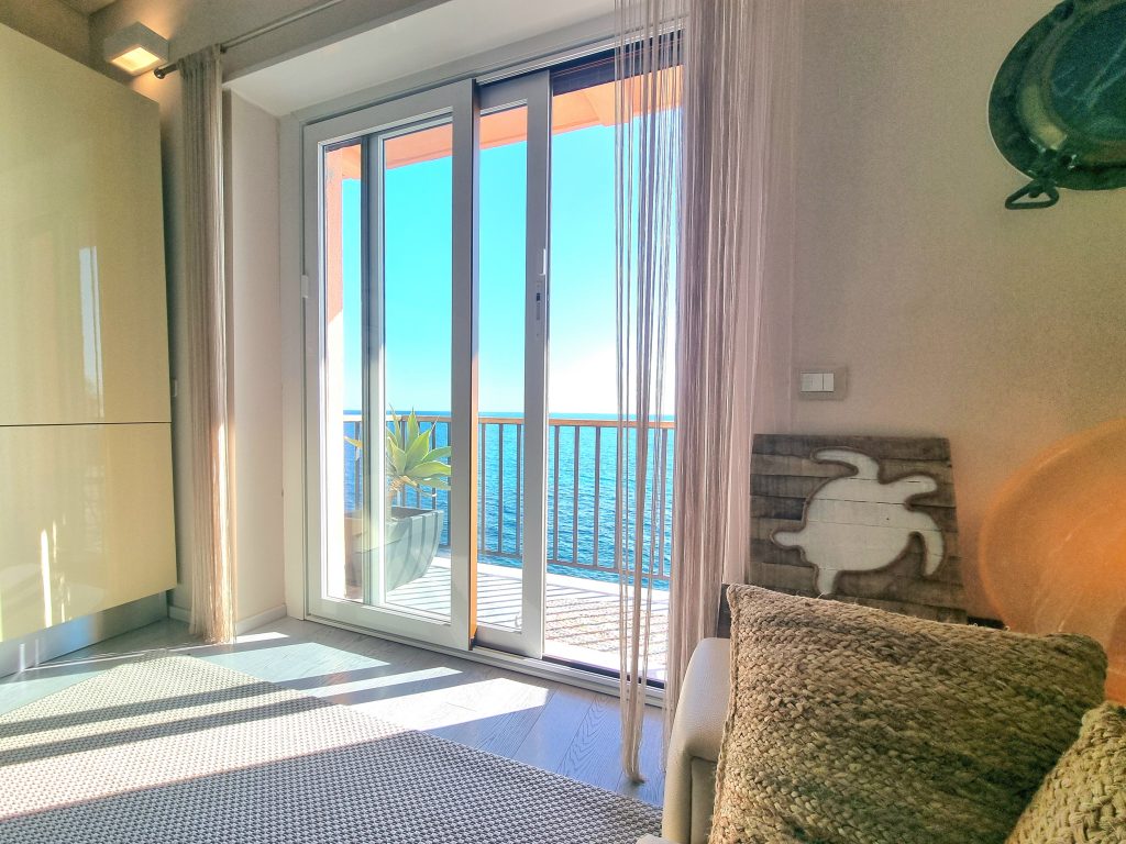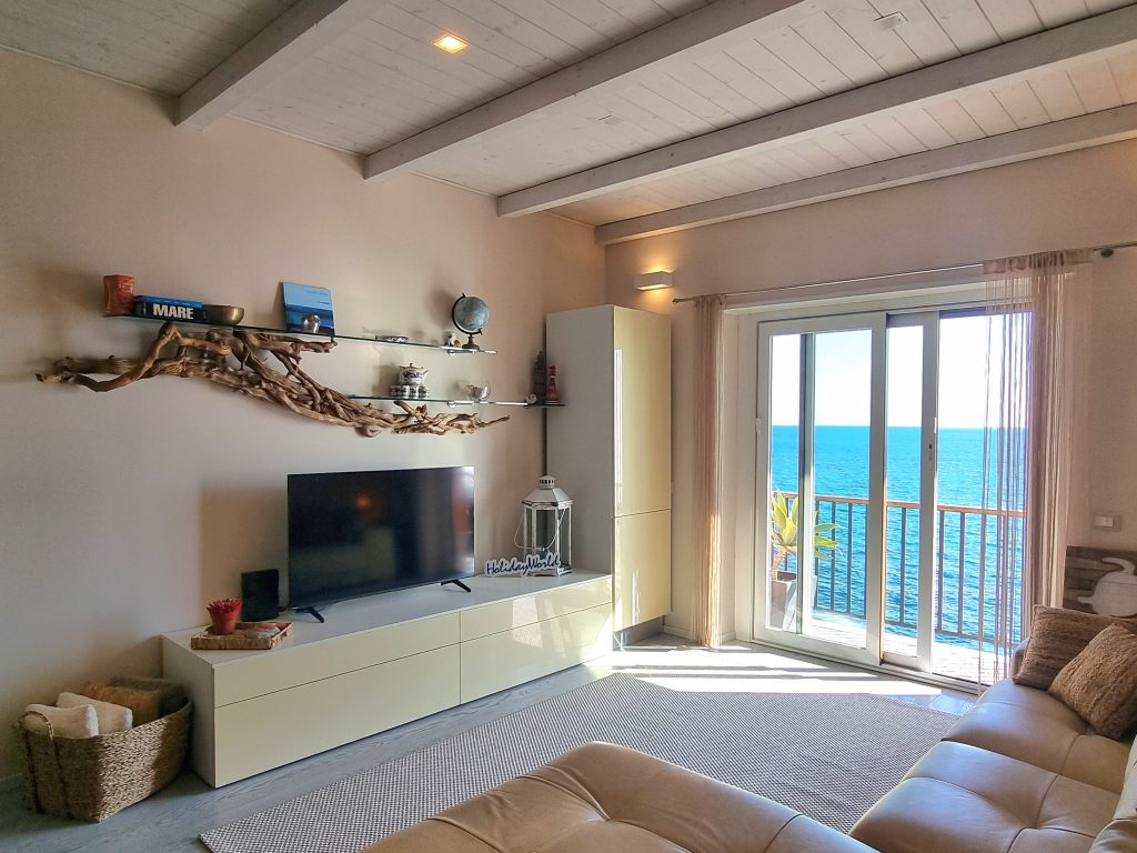 L’appartamento, con ingresso semi-indipendente, si apre su un soggiorno panoramico con cucina a vista e penisola. La grande vetrata fronte mare conduce a un balcone vivibile, che funge da cuore pulsante della casa: a questo si accede anche dalla camera matrimoniale, dotata di cabina armadio, permettendo di godersi la brezza e la vista delle onde direttamente dal letto. Al piano superiore, un terrazzo solarium di proprietà offre uno spazio esclusivo per cene sotto le stelle. La casa è dotata di climatizzazione, Wi-Fi, persiane elettriche e ogni elettrodomestico.