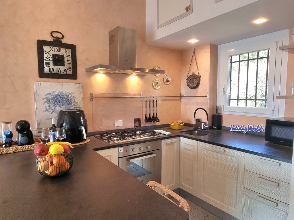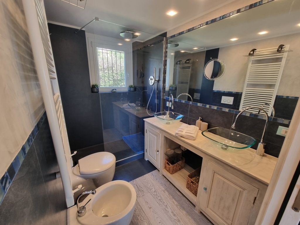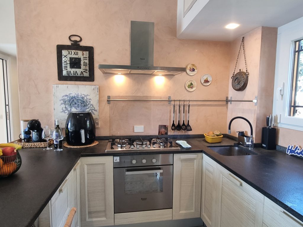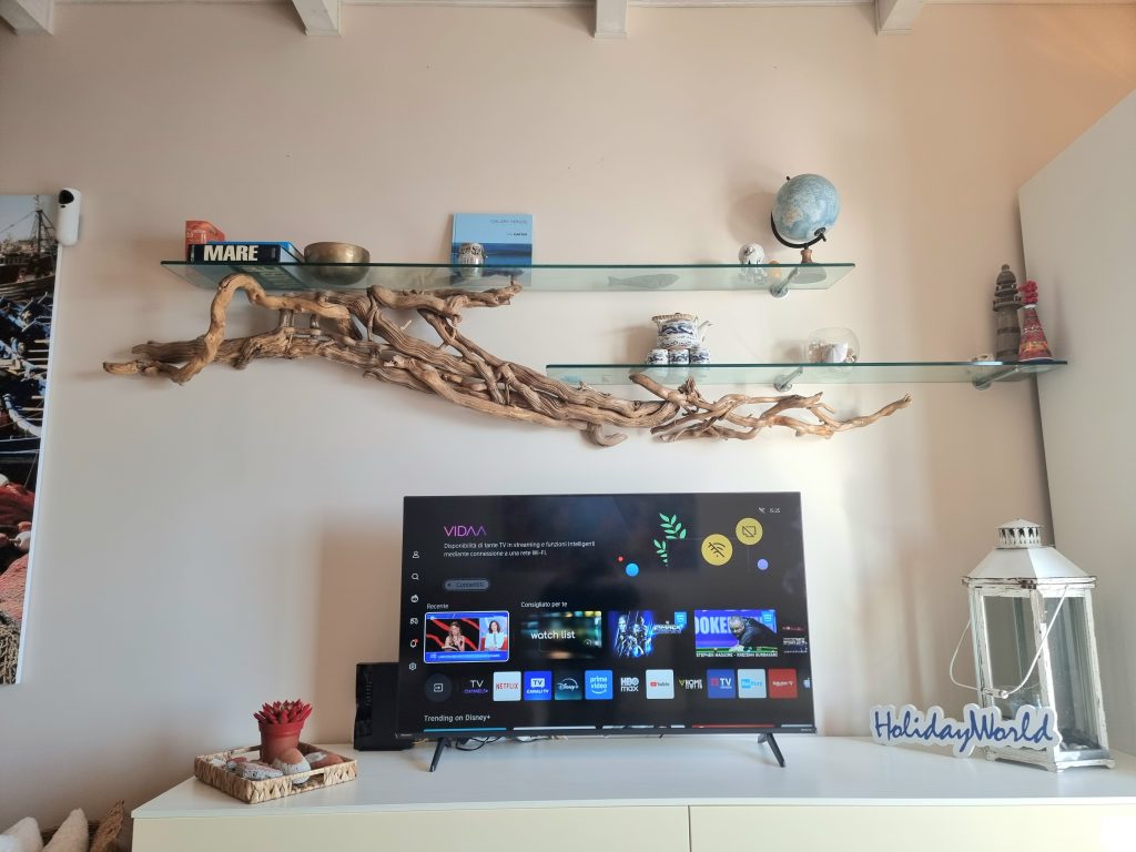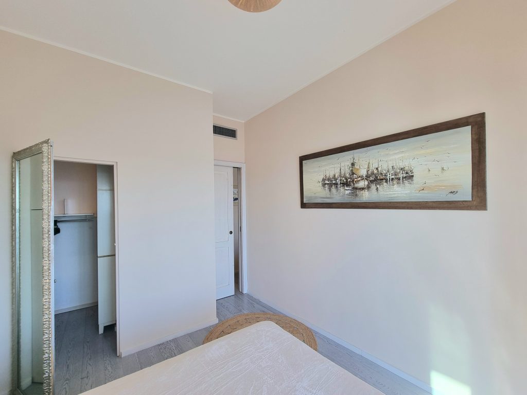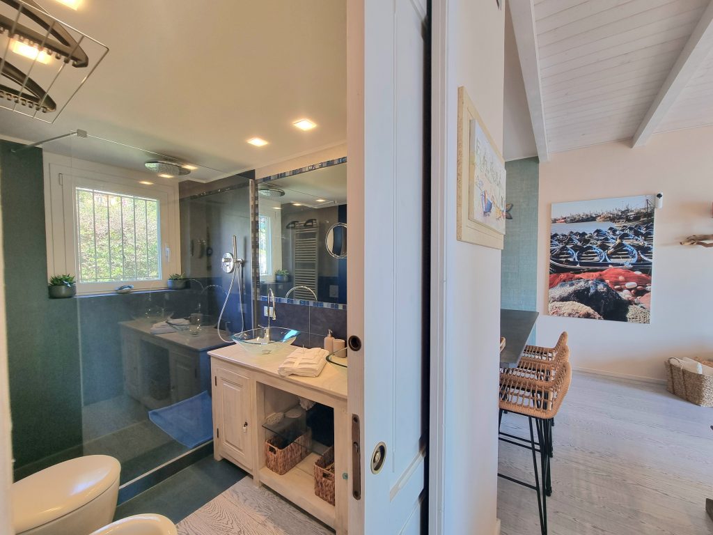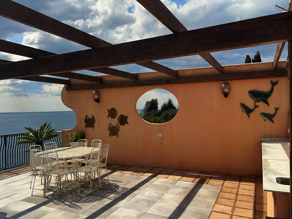L’appartamento, con ingresso semi-indipendente, si apre su un soggiorno panoramico con cucina a vista e penisola. La grande vetrata fronte mare conduce a un balcone vivibile, che funge da cuore pulsante della casa: a questo si accede anche dalla camera matrimoniale, dotata di cabina armadio, permettendo di godersi la brezza e la vista delle onde direttamente dal letto. Al piano superiore, un terrazzo solarium di proprietà offre uno spazio esclusivo per cene sotto le stelle. La casa è dotata di climatizzazione, Wi-Fi, persiane elettriche e ogni elettrodomestico.