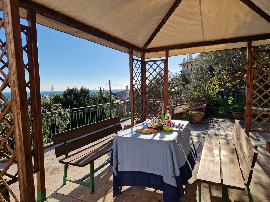 L’ampia terrazza è un vero e proprio angolo di paradiso. Qui, potrete godere di una vista mozzafiato sugli uliveti e sul mare, rilassandovi sotto il gazebo ombreggiante o gustando i pasti all’aperto grazie a un ampio tavolo da pranzo. Per coloro che viaggiano in auto, è disponibile un box auto privato sotto la villa, capace di ospitare fino a due veicoli, un comfort che rappresenta un’ulteriore comodità, non facilmente reperibile in questa zona.